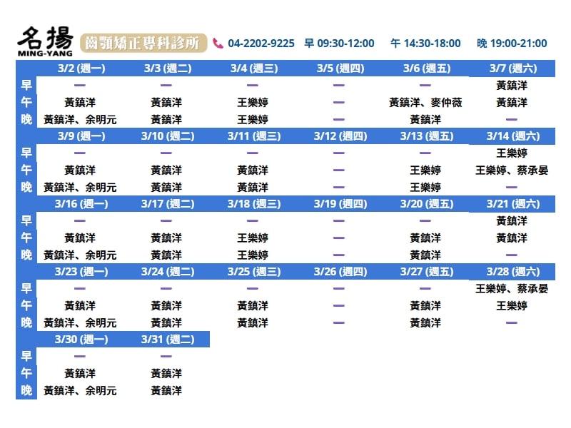 門診時間 診所時間表 早上09:30~12:00 下午14:30~18:00 晚上19:00~21:00 週一 週二 週三 週四 週五 週六 13:00~17:00 醫師門診時間 二月份 三月份 預約諮詢